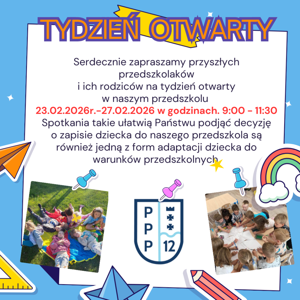 Serdecznie zapraszamy przyszłych przedszkolaków i ich rodziców na tydzień otwarty w naszym przedszkolu 23.02.2026r.-27.02.2026 w godzinach. 9:00 – 11:30. Spotkania takie ułatwią Państwu podjąć decyzję o zapisie dziecka do naszego przedszkola są również jedną z form adaptacji dziecka do warunków przedszkolnych.